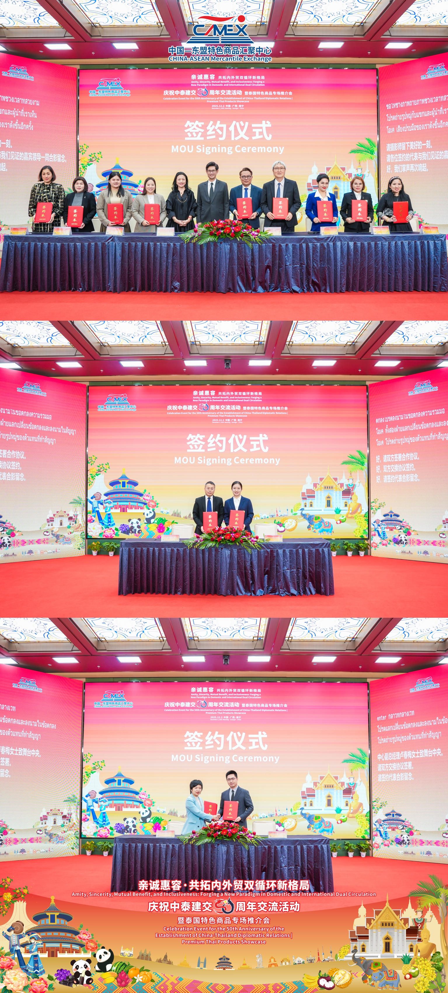 12月2日,“親誠惠容·共拓內(nèi)外貿(mào)雙循環(huán)新格局——慶祝中泰建交50周年交流活動暨泰國特色商品專場推介會”在中國—東盟特色商品匯聚中心隆重舉辦。本次活動由泰國商業(yè)部、泰國商業(yè)部國際貿(mào)易促進司、中國國際貿(mào)易促進委員會廣西壯族自治區(qū)分會、中國—東盟商務(wù)理事會聯(lián)席秘書處、中國—東盟特色商品匯聚中心(簡稱“匯聚中心”)聯(lián)合主辦,中國國際商會廣西商會、中國檢驗認(rèn)證集團廣西有限公司、廣西達(dá)譯科技有限公司、邁越科技股份有限公司、方圓標(biāo)志認(rèn)證集團廣西有限公司作為支持單位參與此次活動。